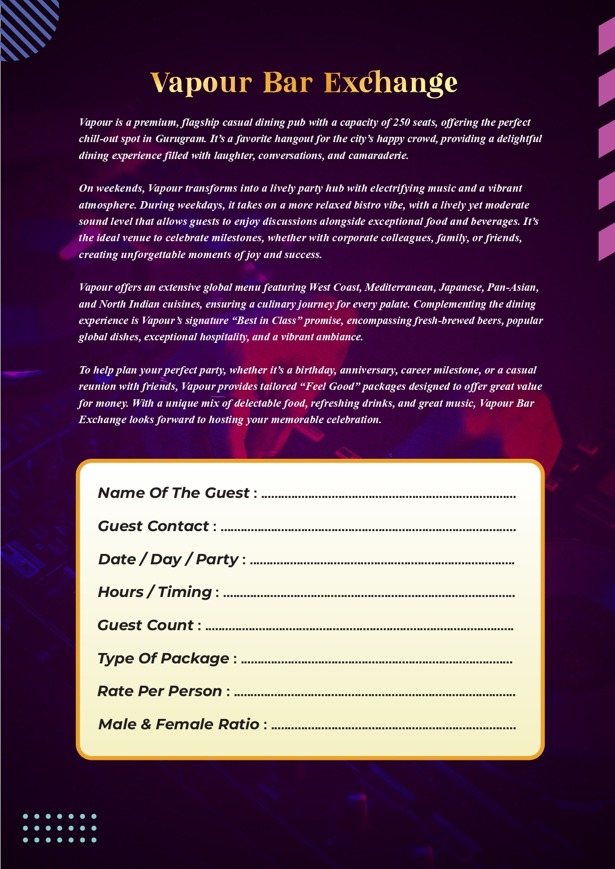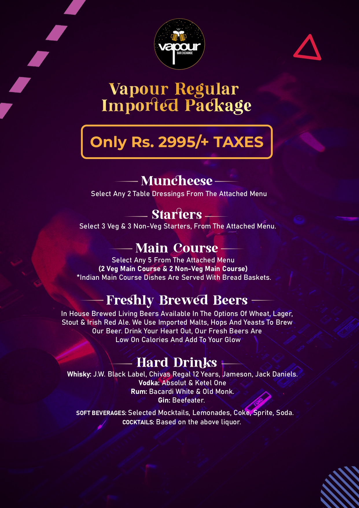 095825 55610Vapour Bar Exchange is Gurgaon's leading craft brewery, offering a unique experience with dynamic drink pricing, cozy wooden interiors, and a vibrant menu inspired by global flavors. Known for our exclusive selection of ALE beers, we bring the authentic taste of brewing to Delhi NCR.